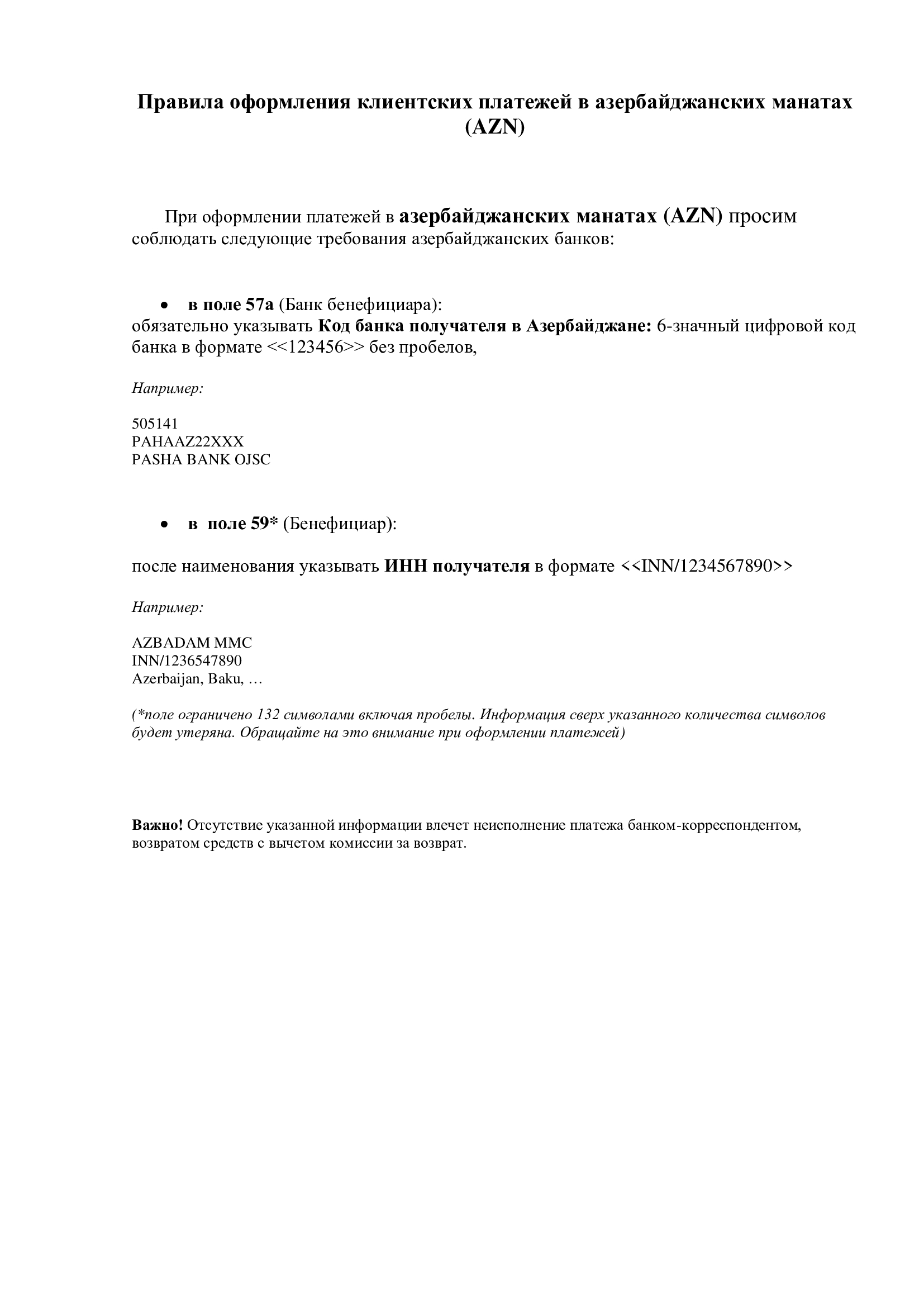 Правила оформления платежей в азербайджанских манатах (AZN)