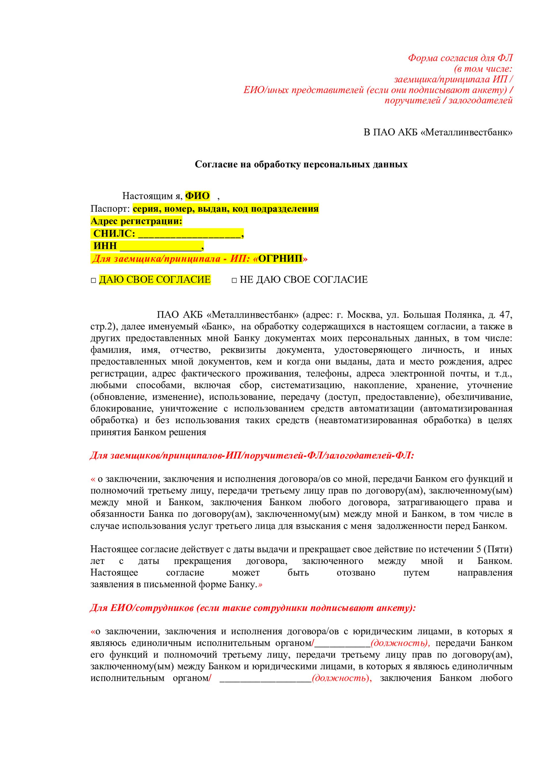 Согласие на обработку персональных данных ФЛ