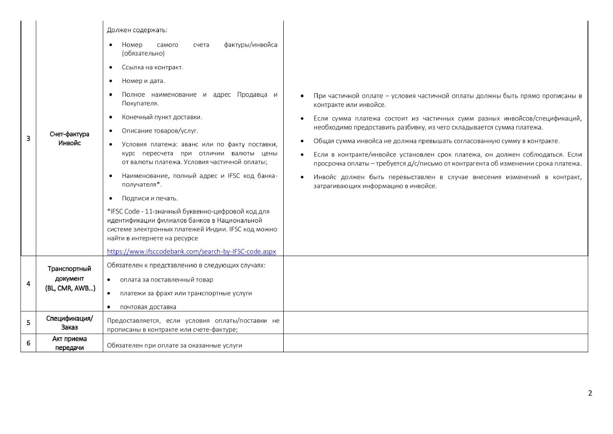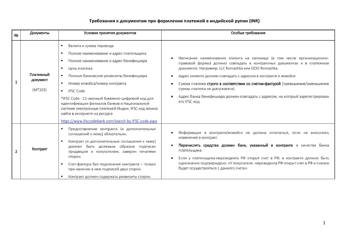Требования к осуществлению платежей через ВТБ, Индия