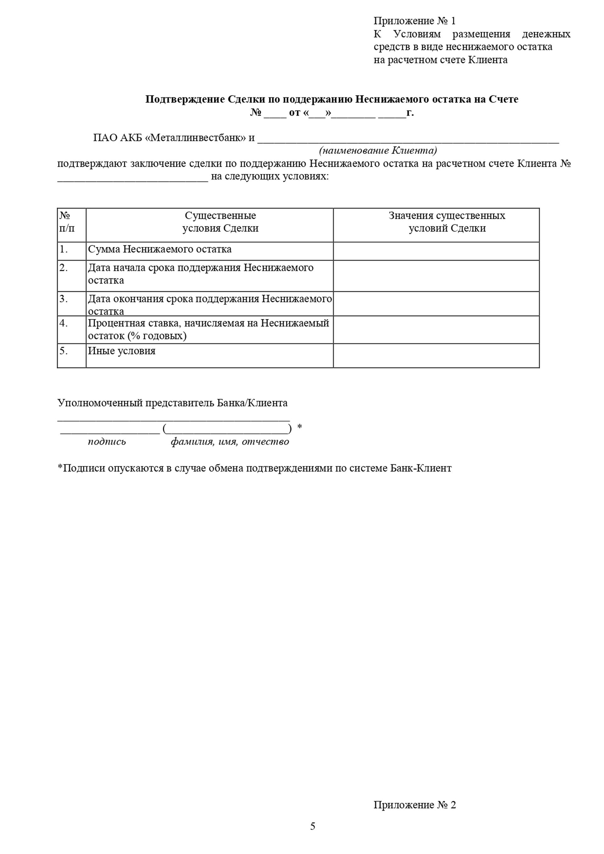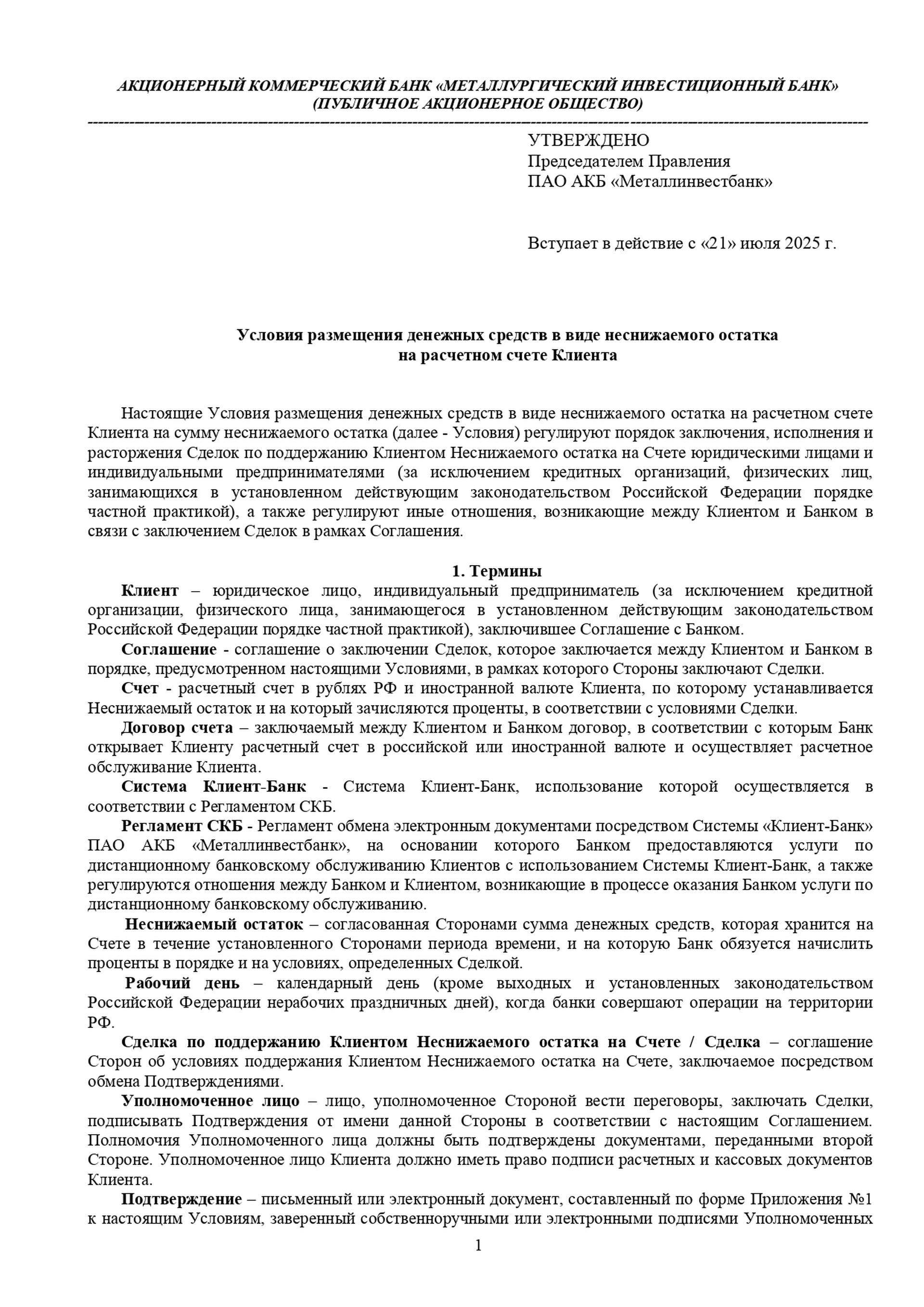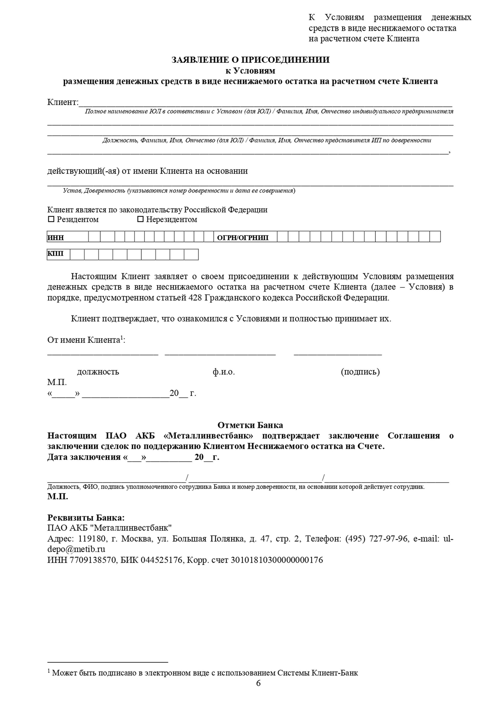 Условия размещения денежных средств в виде неснижаемого остатка на расчетном счете Клиента
